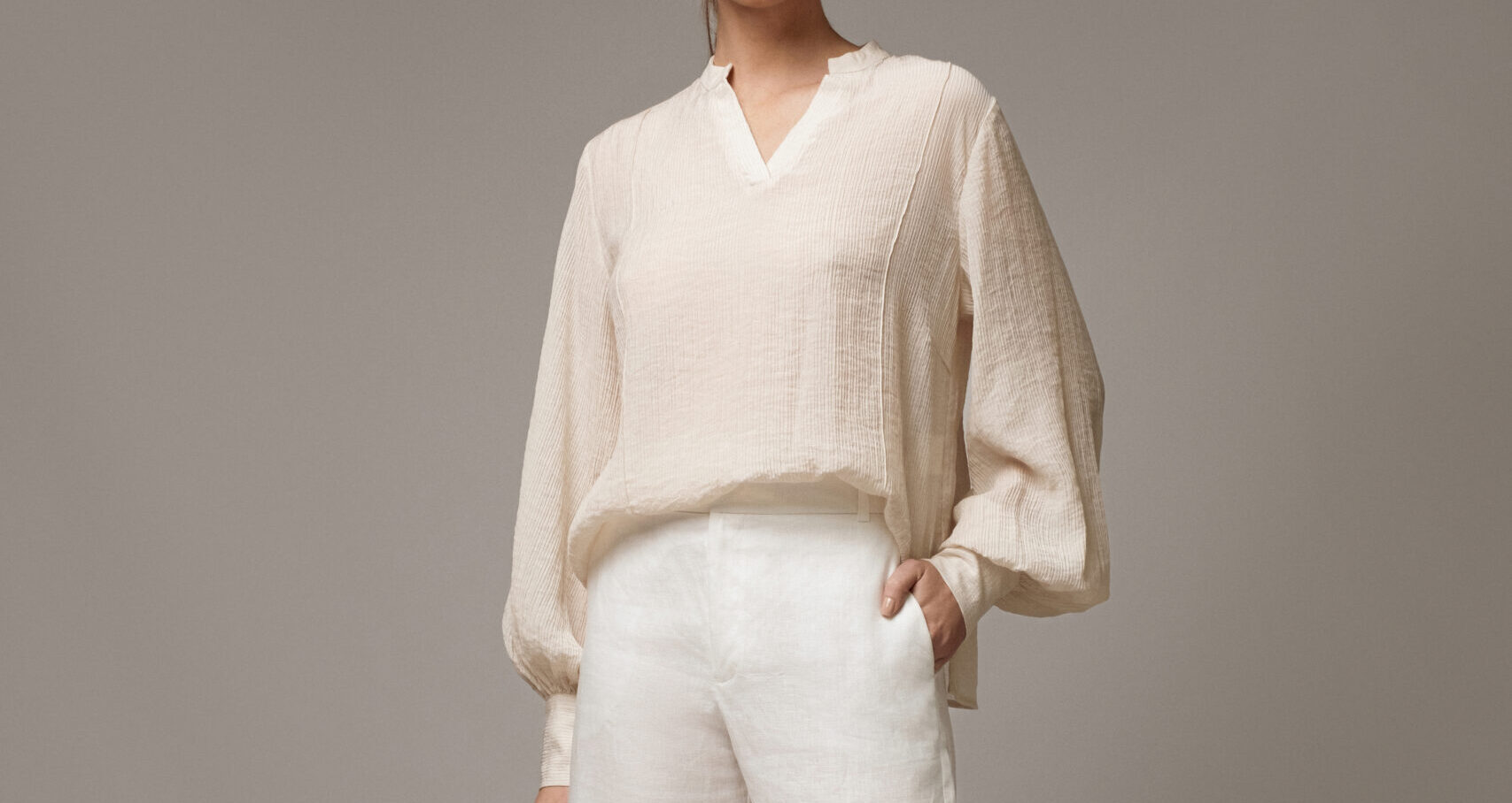Blusa em tecido leve com textura sutil, modelagem solta e caimento fluido. Possui gola em V com acabamento delicado, mangas longas bufantes com punho ajustado, trazendo elegância e conforto para produções sofisticadas ou casuais. Ideal para compor looks frescos e atemporais.