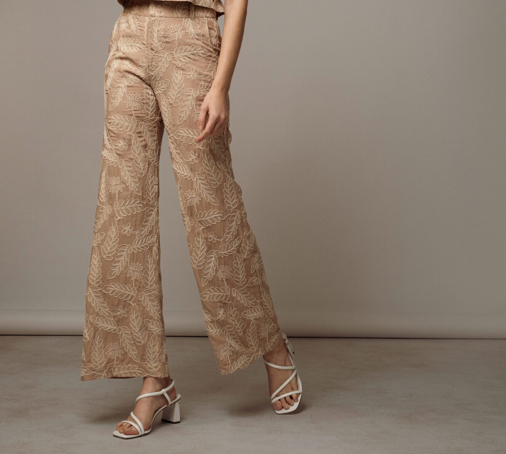 Calça feminina em tom bege com bordado floral em alto-relevo, que adiciona textura e elegância à peça. Possui modelagem reta com caimento leve e sofisticado, além de cós alto que valoriza a silhueta. Ideal para composições refinadas e confortáveis, perfeita para ocasiões casuais chic ou ambientes de trabalho.