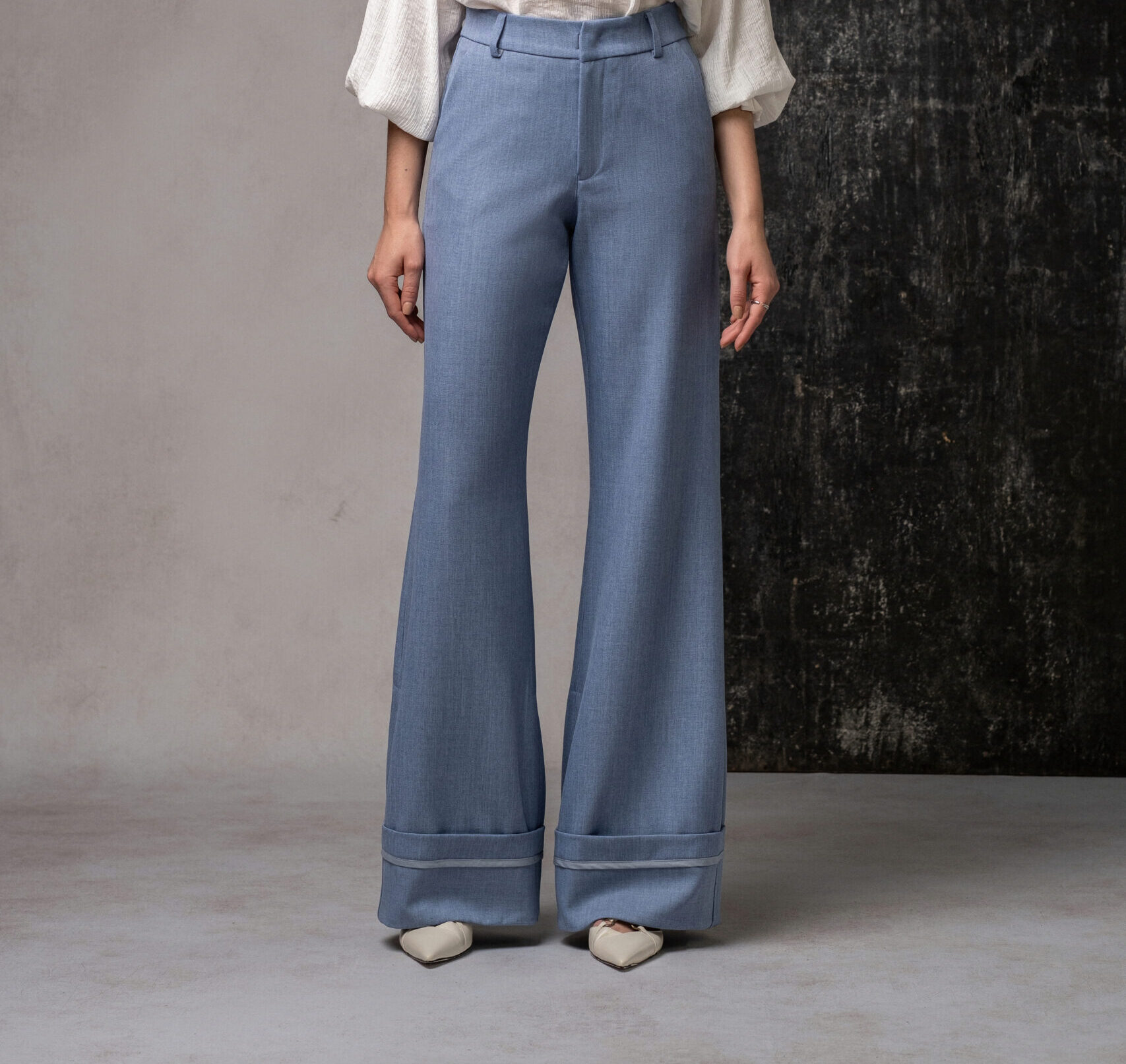 Calça feminina em denim leve com modelagem pantalona e caimento elegante. Possui cintura alta, passantes no cós e detalhe de barra larga dobrada, que confere um toque moderno e sofisticado à peça. Ideal para composições versáteis que transitem entre o casual chic e o look profissional com estilo.
