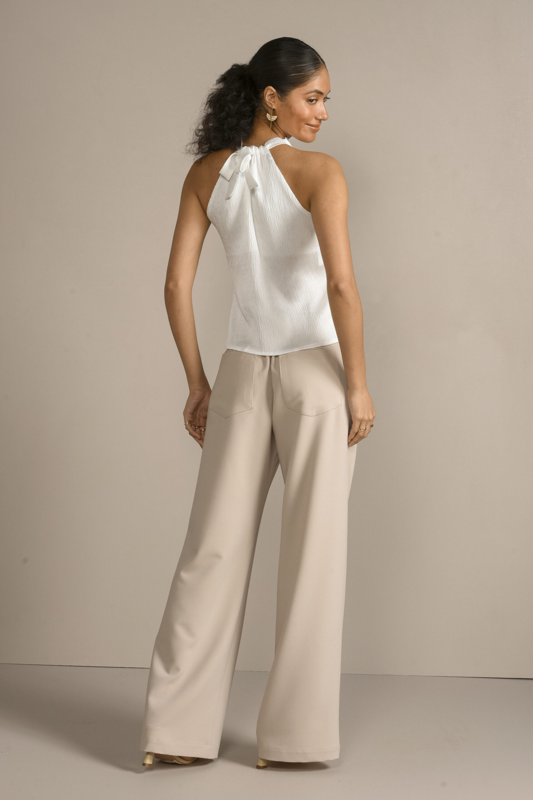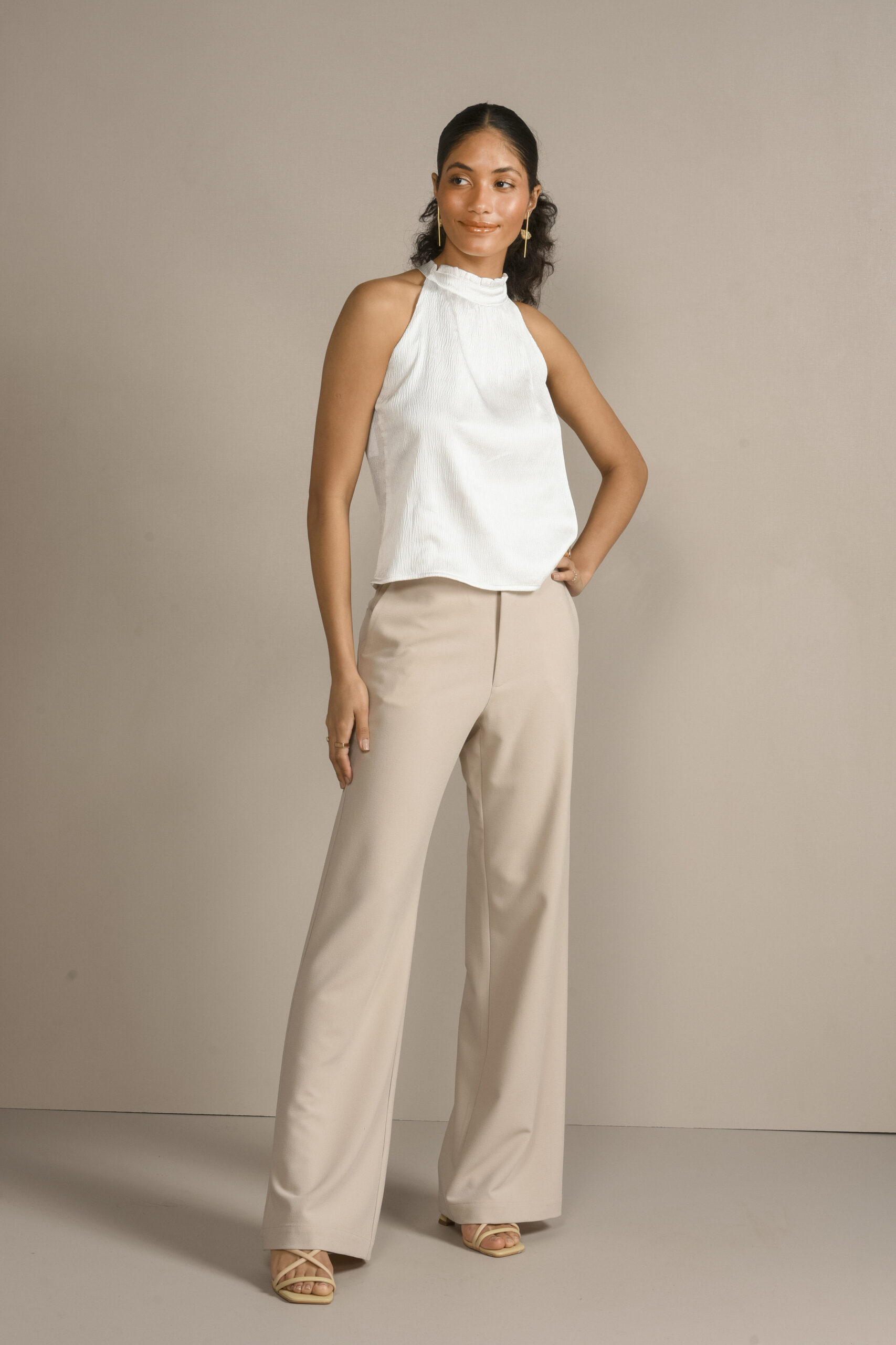 Com um design elegante e atemporal, esta calça de alfaiataria em tom bege claro é sinônimo de sofisticação e versatilidade. Possui cintura alta e modelagem reta com caimento fluido, que alonga a silhueta e proporciona um visual refinado. O tecido encorpado garante estrutura sem abrir mão do conforto, sendo ideal tanto para produções formais quanto para composições mais descontraídas com peças leves.