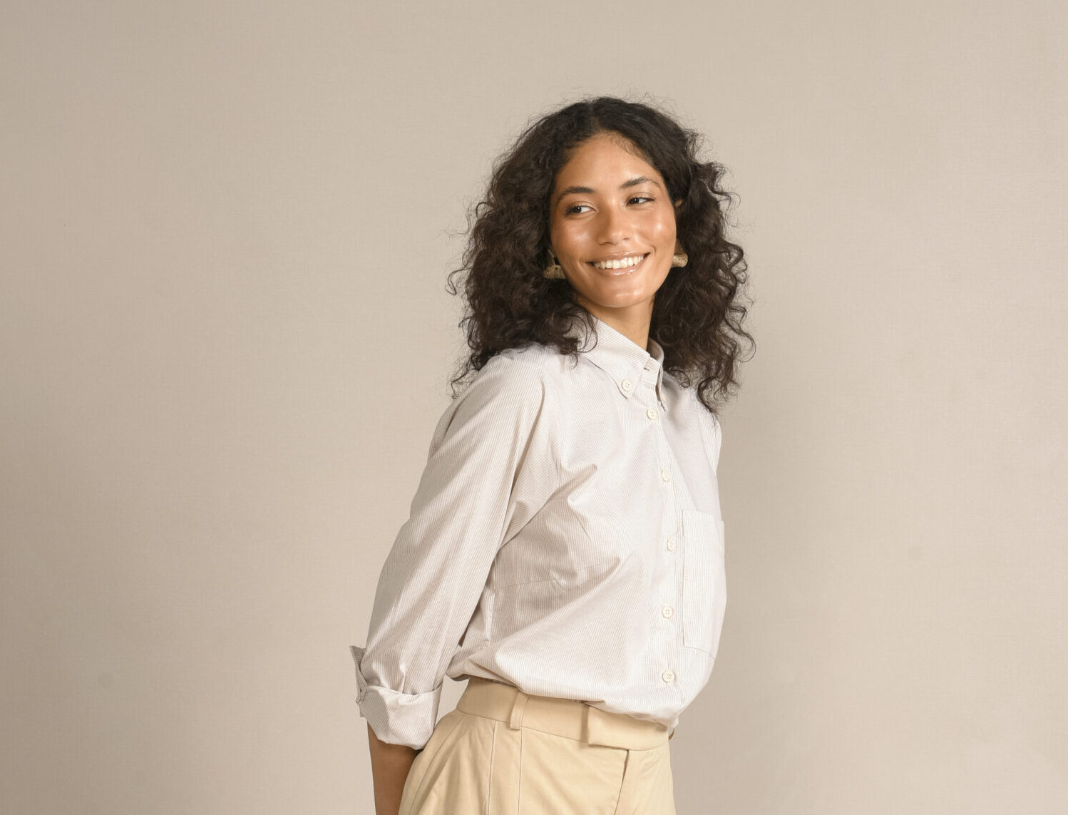 Camisa feminina de manga longa com design clássico e atemporal. Confeccionada em tecido leve de algodão com padronagem discreta, possui colarinho estruturado, fechamento frontal por botões e bolso funcional no peito. As mangas longas com punhos ajustáveis e a modelagem levemente solta garantem conforto e elegância. Perfeita para compor looks formais ou casuais com sofisticação e leveza, especialmente quando usada com peças de cintura alta ou em sobreposições.