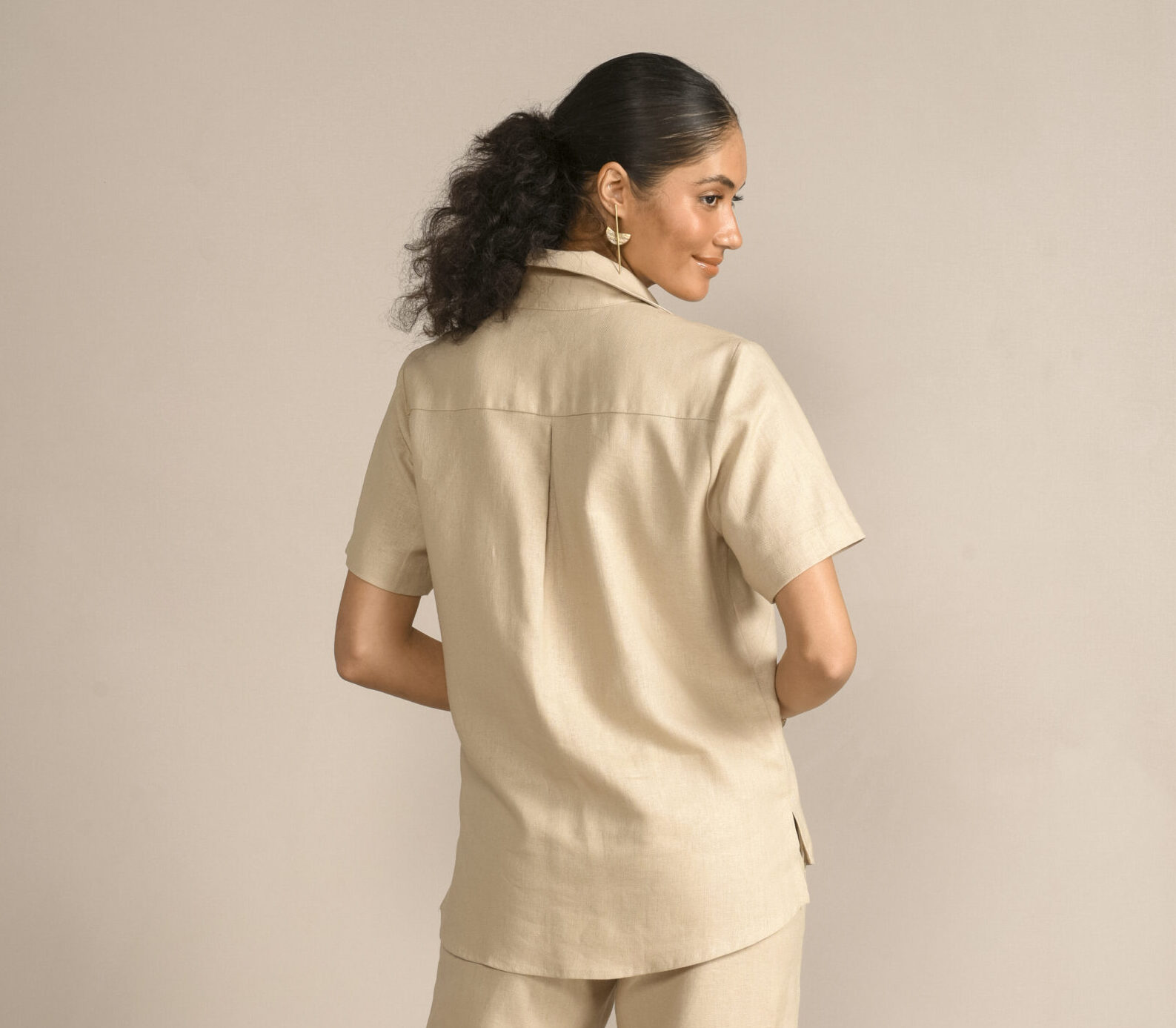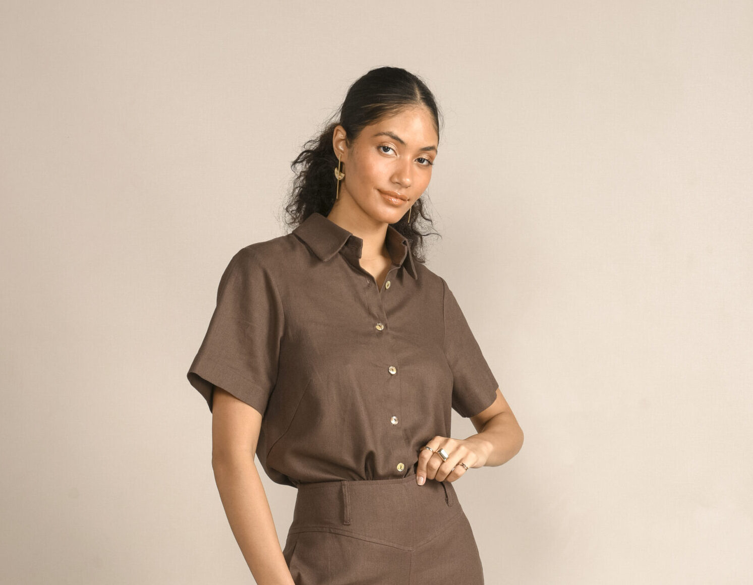 Camisa feminina de manga curta com design minimalista e atemporal. Confeccionada em tecido leve com toque de linho, a peça oferece conforto térmico e sofisticação natural. Possui colarinho tradicional, fechamento frontal por botões e modelagem levemente solta, garantindo um caimento impecável ao corpo. O tom terroso reforça a elegância discreta da peça, ideal para composições monocromáticas, looks de trabalho ou produções casuais com um toque refinado.