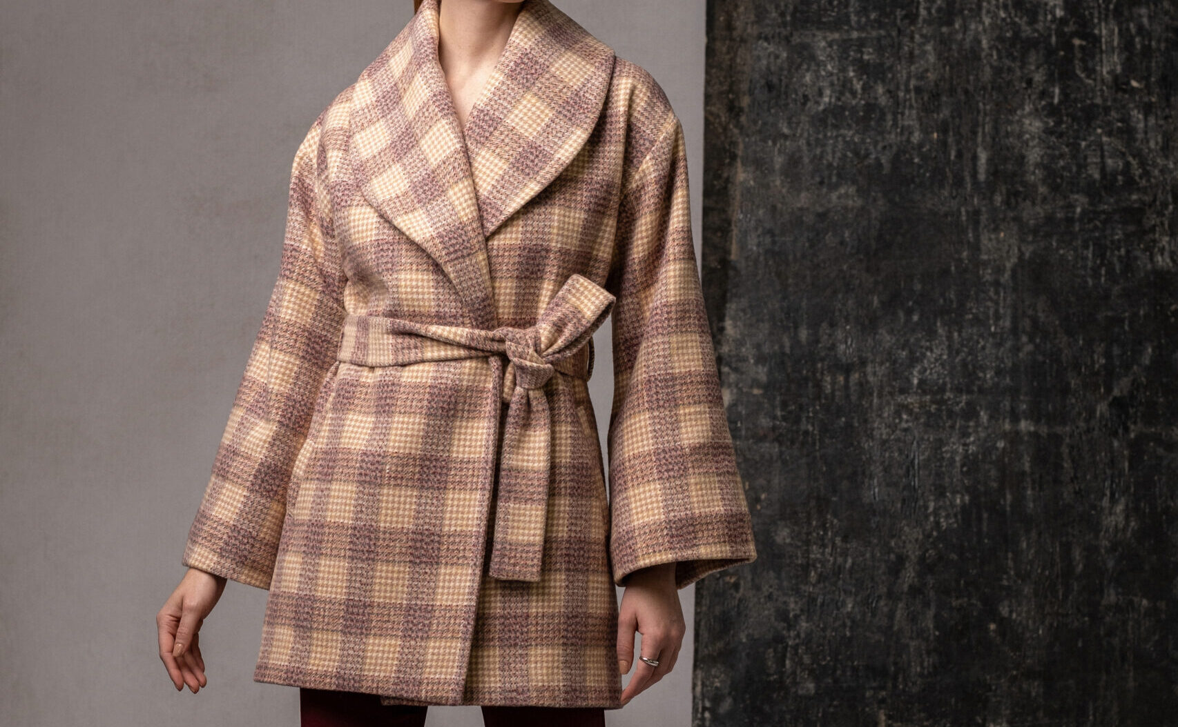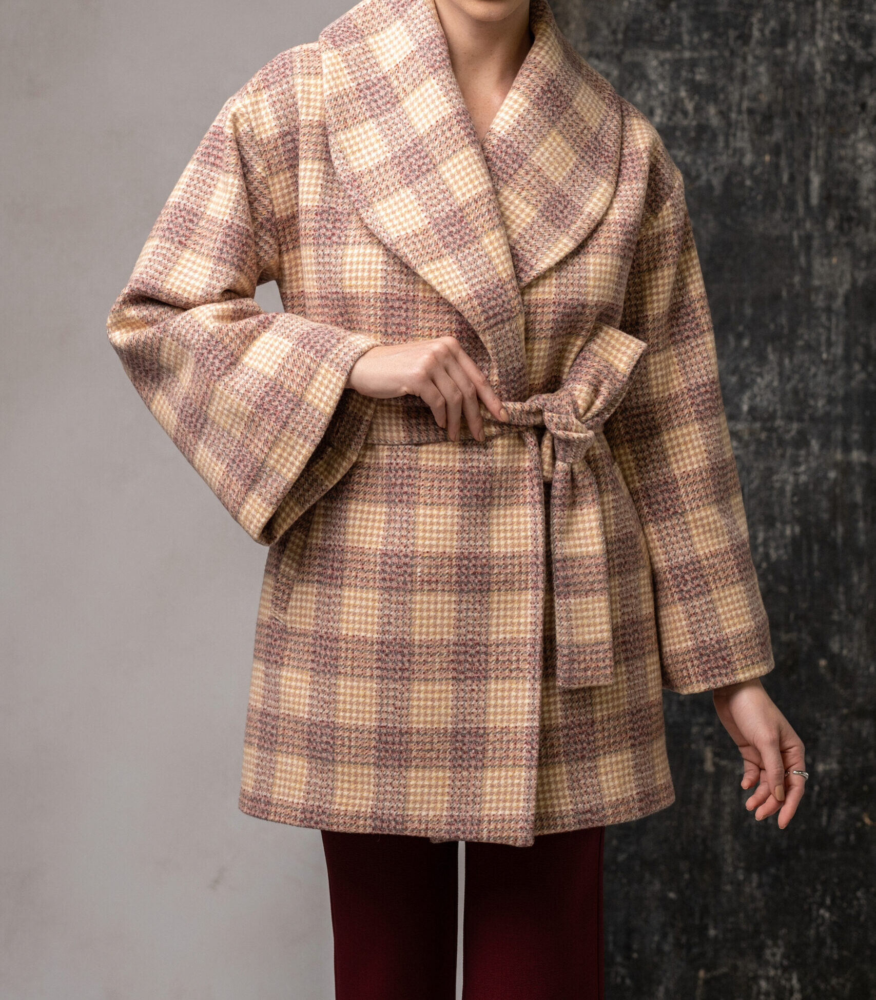 Casaco feminino em padronagem xadrez, com tonalidades suaves de bege, lilás e amarelo, perfeito para um visual elegante e aconchegante. Possui modelagem ampla com mangas largas, gola ampla tipo smoking e faixa para amarração na cintura, que proporciona ajuste e valoriza a silhueta. Ideal para dias frios com um toque retrô e sofisticado.