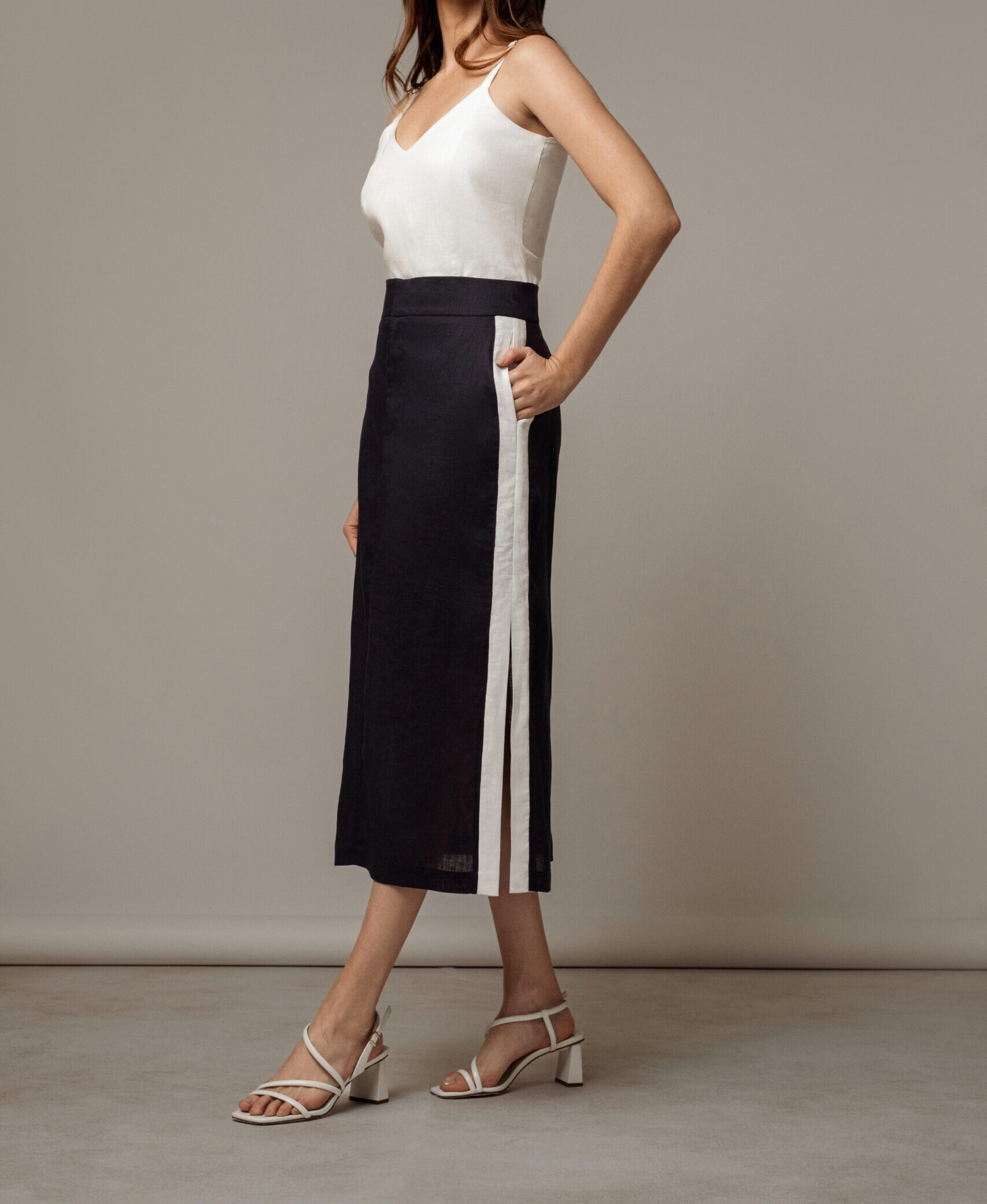 A saia da imagem é midi, confeccionada em linho, com modelagem reta e cintura alta, oferecendo um caimento elegante e moderno. O diferencial da peça está na faixa lateral em tom claro contrastante, que segue toda a extensão da saia e acrescenta um toque esportivo e contemporâneo ao visual. Ideal para composições sofisticadas com um ar despojado.